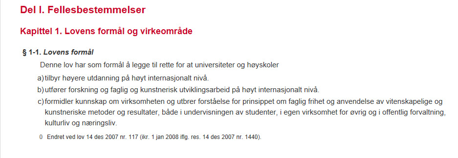 Blir du inspirert? Universitets- og høyskoleloven sidestiller forskningskommunikasjon (formidling) med utdanning og forskning (faksimile fra lovteksten).
