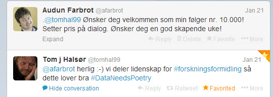 Nylig kunne jeg ønske Tom J. Halsør (lenke til Twitterprofil) velkommen som min følger (follower) nummer 10.000. Det er et tall som gjør meg ydmyk, og også noe som forplikter. Jeg er fullt klar over at mange av dem ikke lenger er aktive på Twitter, kanskje var de det heller aldri. Men, det er likevel mer enn nok action blant mine Twitter-kontakter.