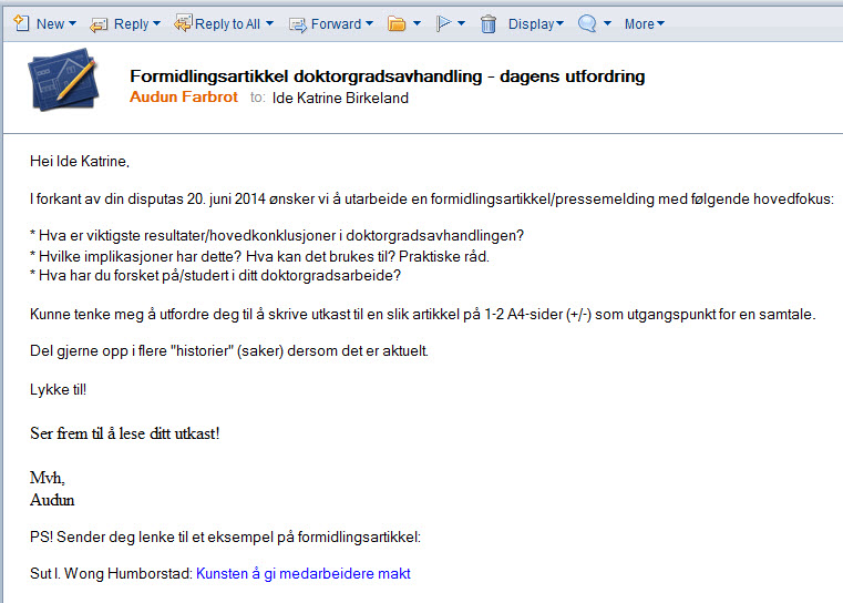 Selv bruker jeg E-post blant annet til å invitere/utfordre forskere til å fortelle hva de kan og hva de har funnet ut til andre enn sine kolleger. Her er et lite eksempel på hvordan jeg skriver til en doktorgradsstipendiat som er klar for å disputere for doktorgraden.