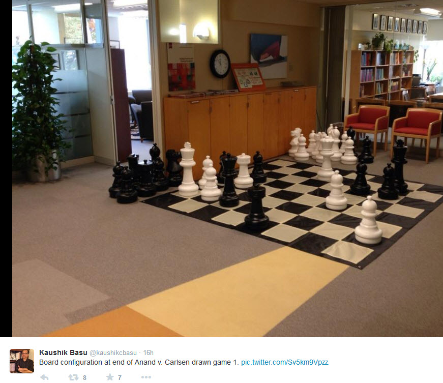 Ta en kikk på illustrasjonsbildet ovenfor. Bildet er lagt ut på Twitterprofilen til Kaushik Basu søndag 9. november 2014 etter det første partiet i VM-lampen mellom Magnus Carlsen og Visjy Anand i Sotsji.