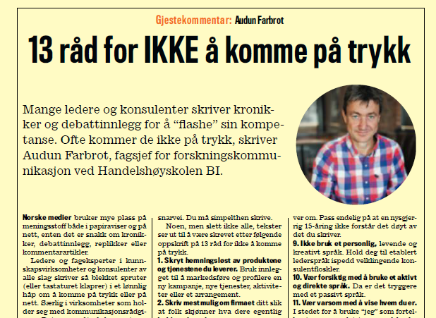 Det har gitt meg råstoff til å skrive en kommentarartikkel med overskriften «13 råd for IKKE å komme på trykk» (lenke til artikkelen som også er publisert på BI Business Review), basert på førsteutkast til artikler på skrivekurs. Den artikkelen kom faktisk på trykk (!), i sommerutgaven av tidsskriftet Kapital.